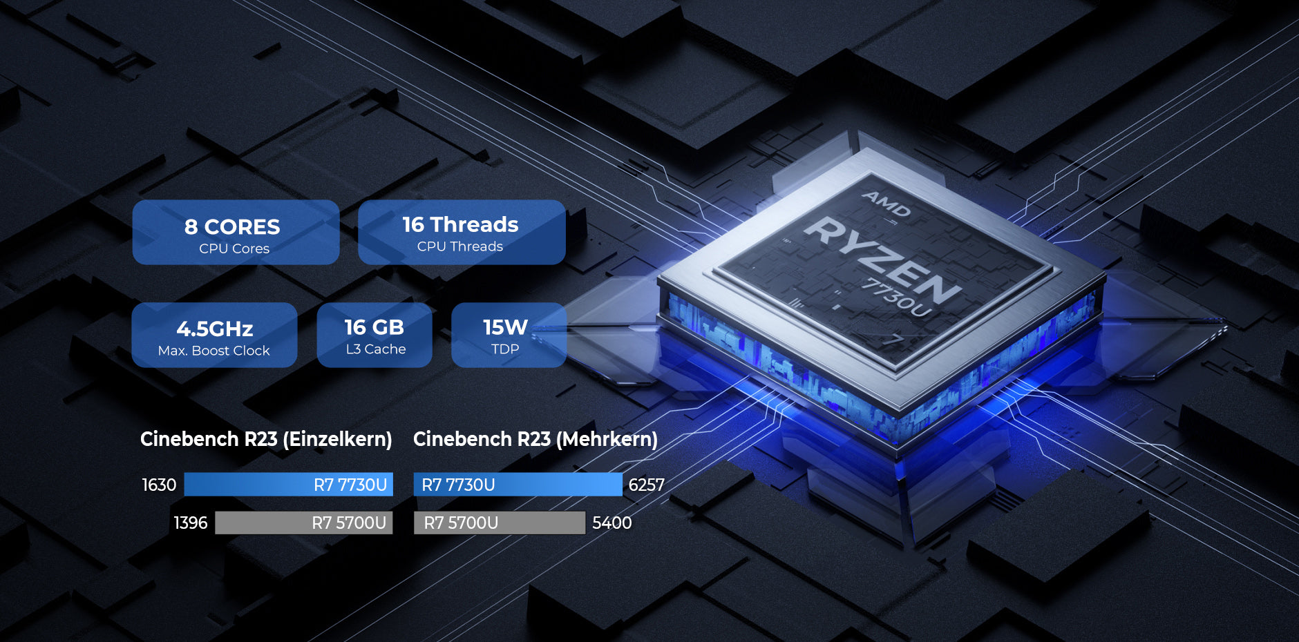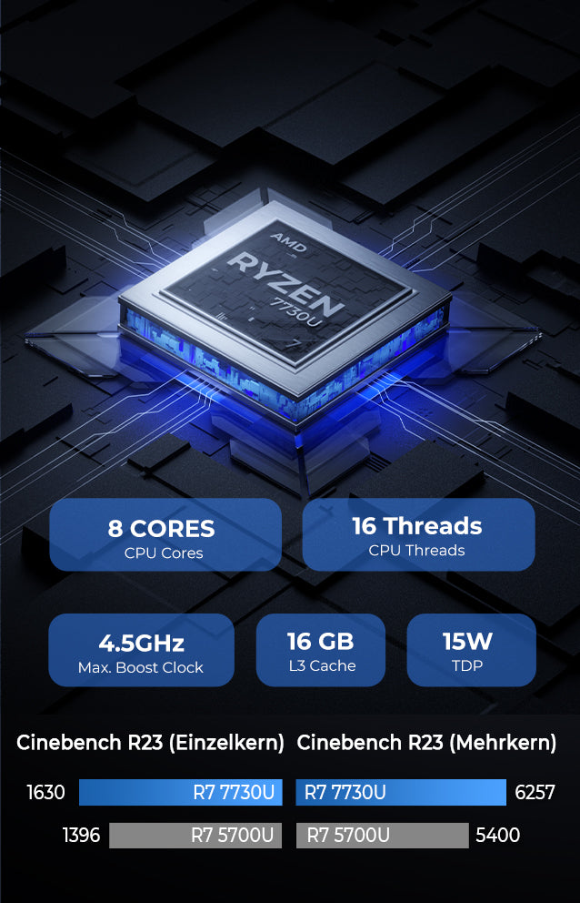 | Prozessor | AMD Ryzen™ 7 7730U Prozessor, 8 Kerne/16 Threads (Zen3-Architektur, TSMC 7nm FinFET Prozessorprozess, 16 MB L3-Cache, Basisfrequenz 2,0 GHz, Turbofrequenz bis zu 4,5 GHz) |