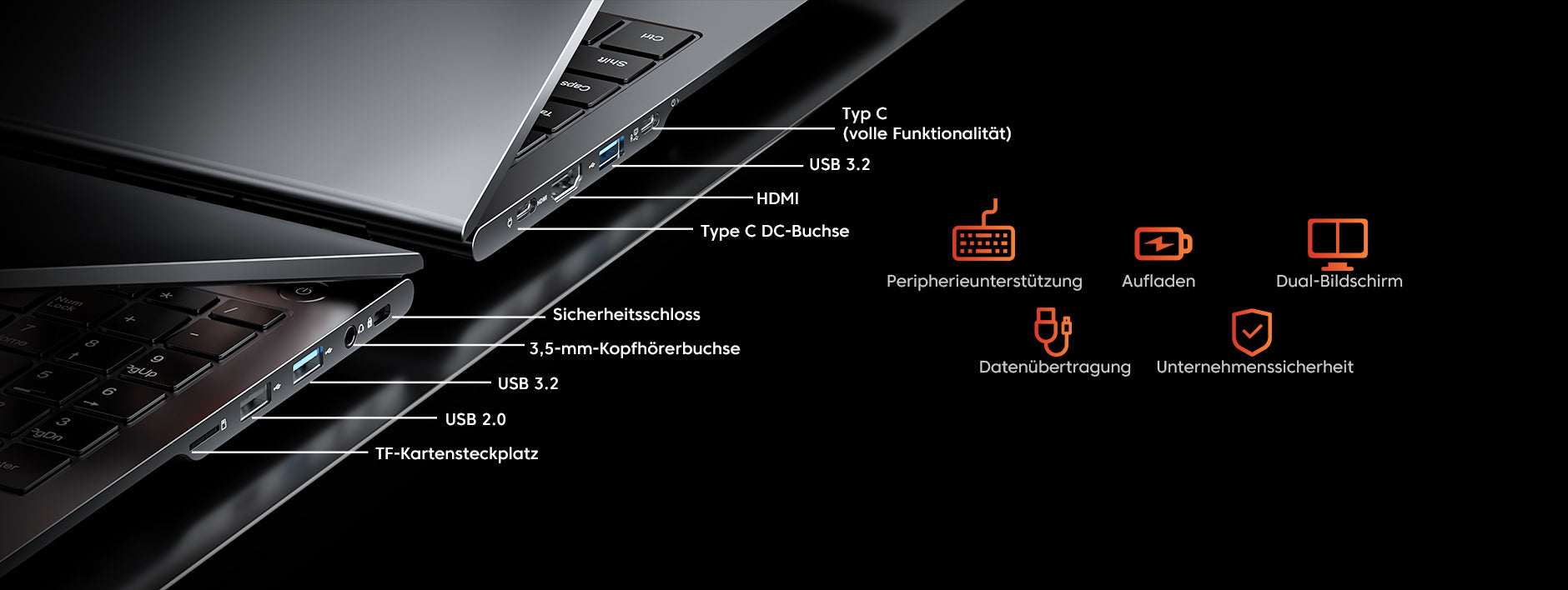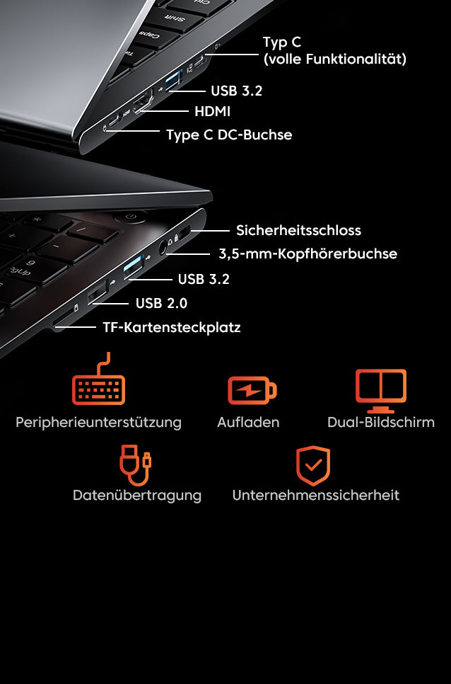 USB 3.2*3 3,5-mm-Standardkopfhörerbuchse*1 DC IN*1 Typ-C-Stromanschluss*1 HDMI 1,4*1 Typ-C*1 (PD-Laden/DP1.4, 8K@60Hz/20Gbps Datenübertragung) TF-Kartensteckplatz*1 |