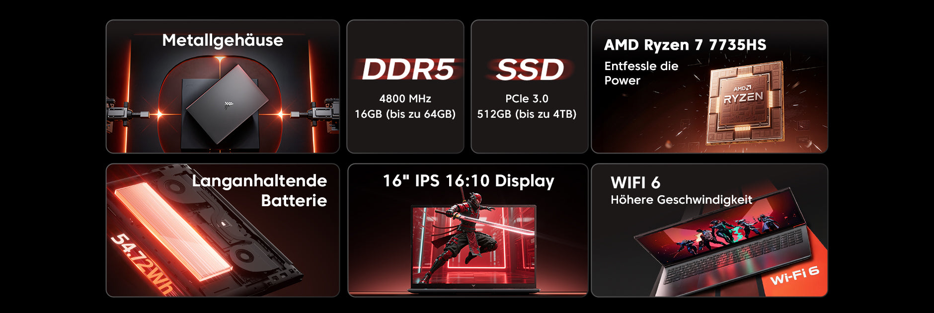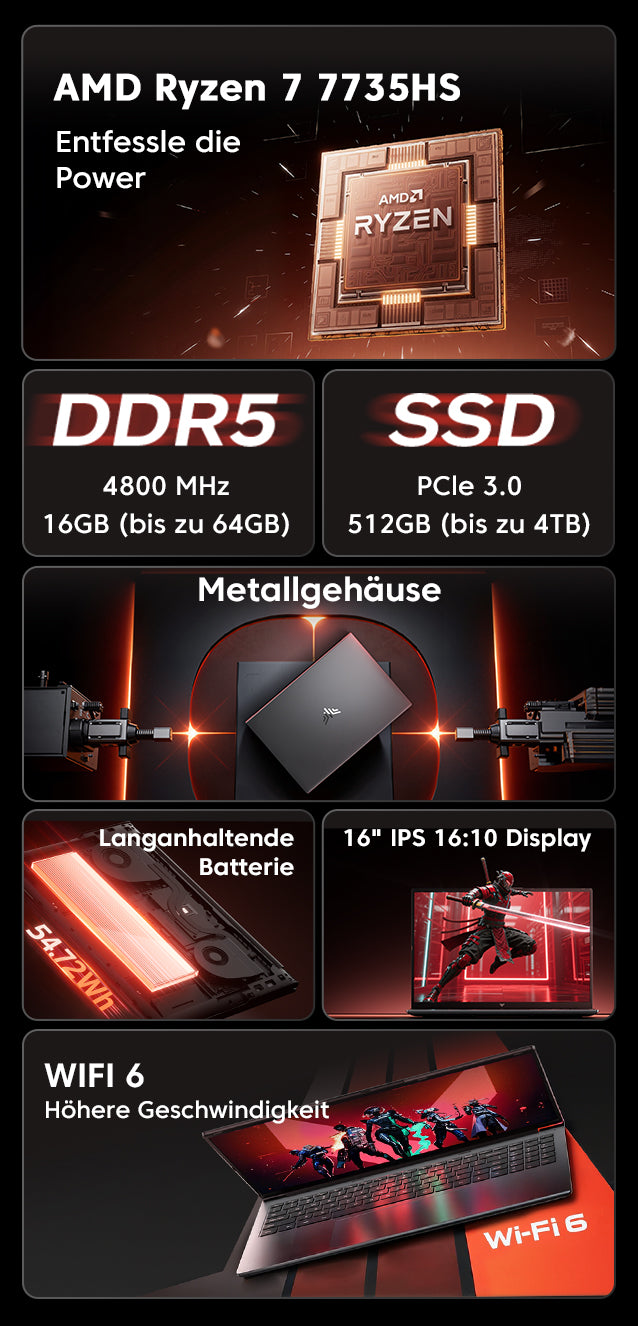 Das neue Notebook ACEMAGIC S16 ist mit dem AMD Ryzen 7 7735HS Prozessor ausgestattet, dessen Turbo-Frequenz bis zu 4,75 GHz erreichen kann. 16 GB DDR5 RAM und eine 512 GB SSD sorgen für reibungslosen Alltagsgeschäftsvorfall, und das RAM kann auf bis zu 64 GB erweitert werden, die SSD auf bis zu 4 TB. Ein 16-Zoll-IPS-Display im Format 16:10 verbessert die Arbeitsproduktivität und das Surferlebnis.