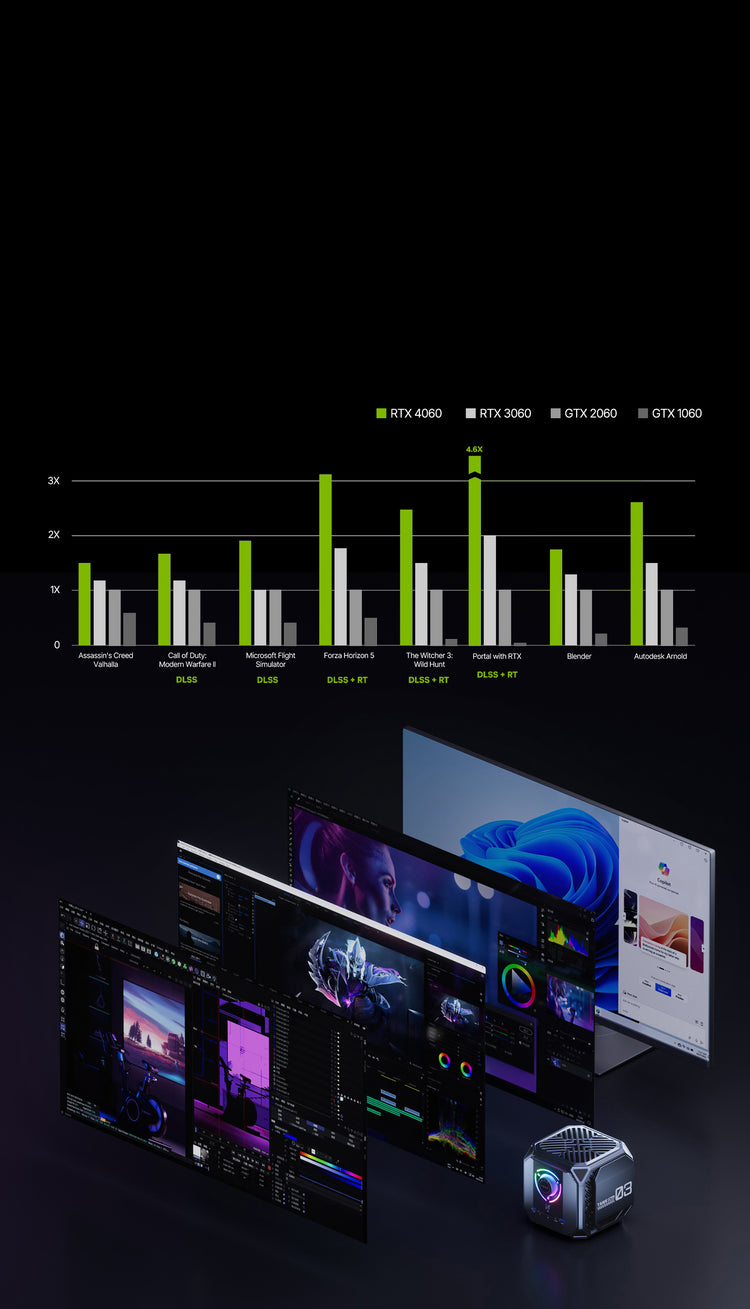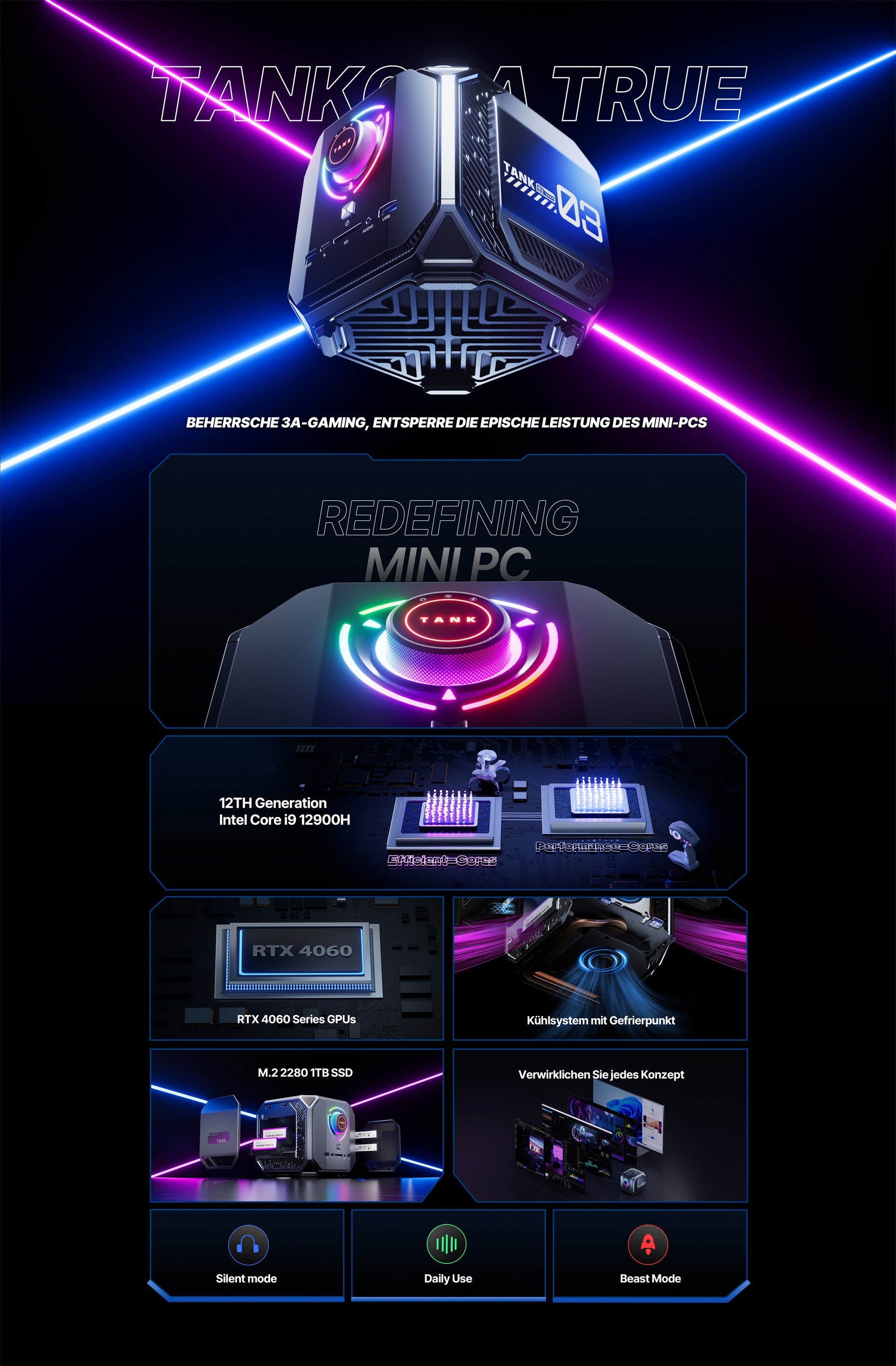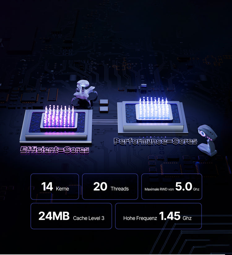 Der TANK03 ist mit einem Intel Core i9-12900H-Prozessor ausgestattet, der 14 Kerne und 20 Threads bietet. Die integrierte GeForce RTX 4060 Grafikkarte. Sie unterstützt fortschrittliche Technologien wie Raytracing, DLSS und Reflex für beeindruckende visuelle Effekte und Leistung.