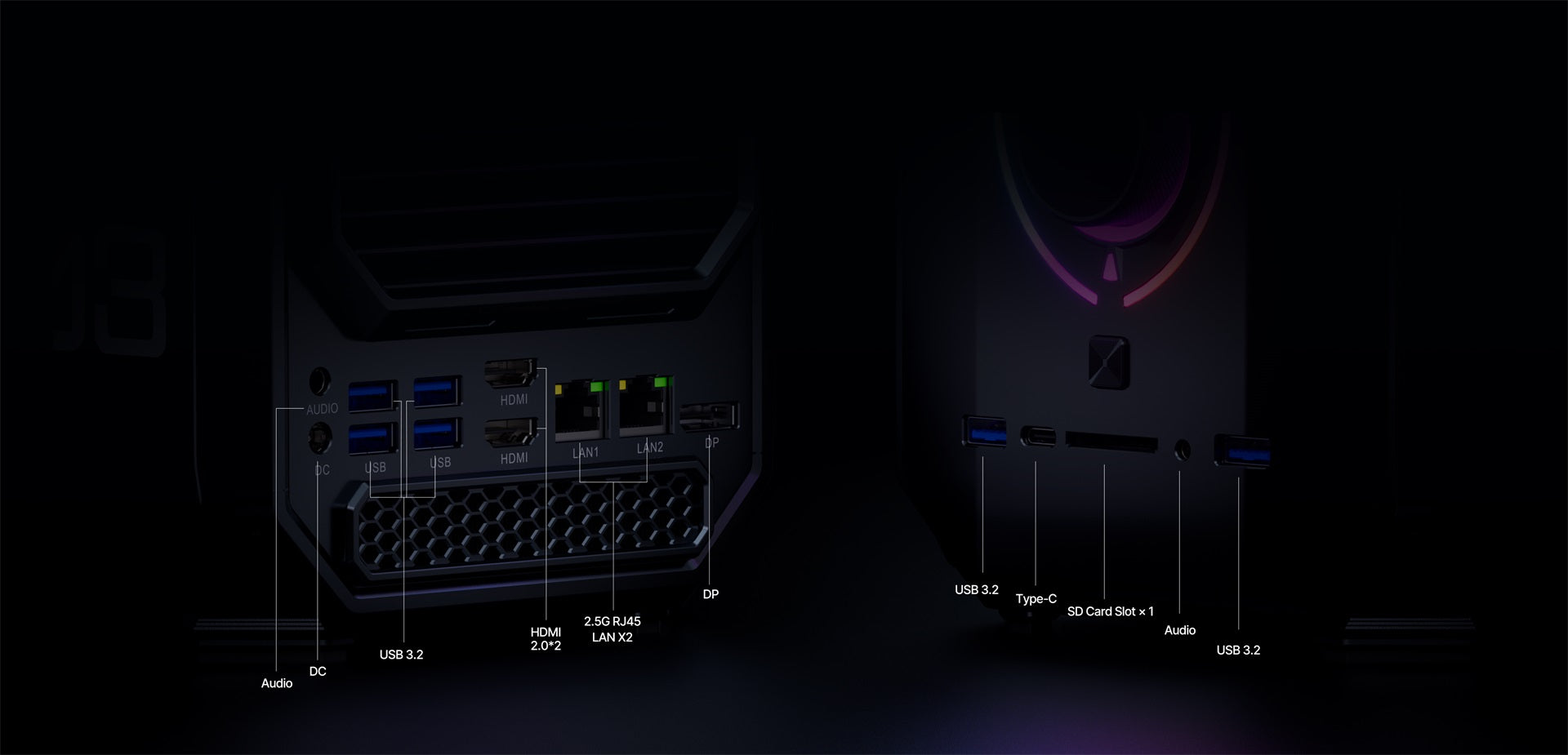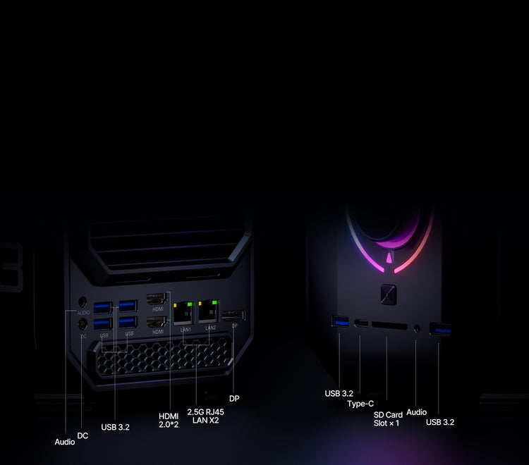 10 M/100 M/1000 M/2,5 Gbps adaptiv RJ45 Gigabit Ethernet*2 USB 3.2 Gen 2 Typ-A*3 USB 3.2 Gen 1 Typ-A*3 USB 4.0 Typ-C*1 (8K@60Hz) DC-Eingangsbuchse*1 HDMI 2.0*3 (4K@60Hz) DP 2.0*3 (8K@60Hz) 3,5-mm-Audiobuchse*2 |