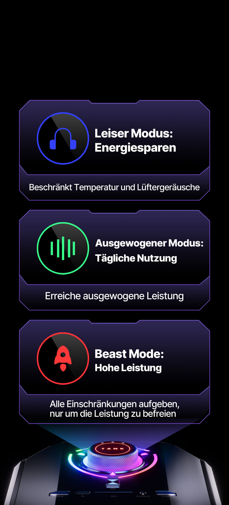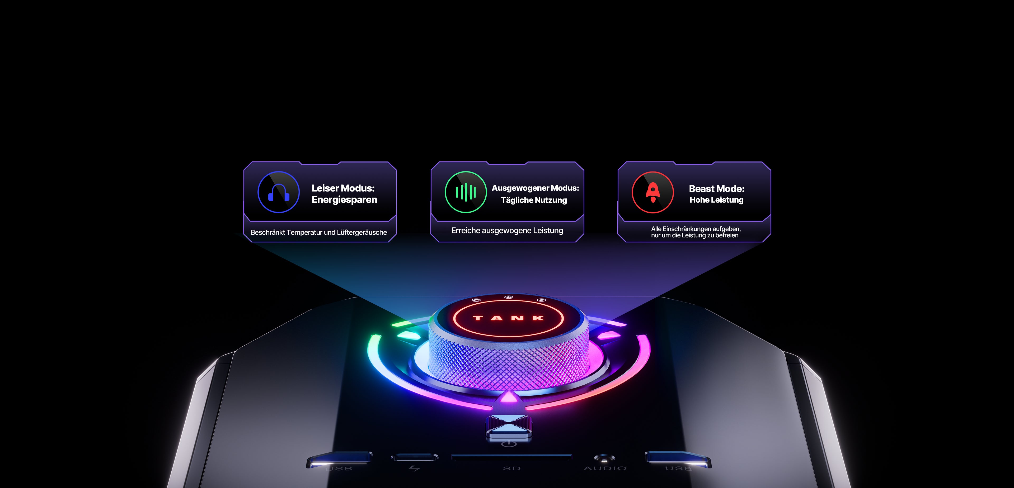 Das Storm 2.0 Ultimate Cooling System des TANK03 besteht aus 7 kühlenden Kupferrohren (5 für die GPU und 2 für die CPU), 5 umlaufenden Belüftungsöffnungen und 3 Kühllüftern. Dieses Design gewährleistet eine effiziente Wärmeableitung und schützt die Komponenten unter anspruchsvollen Bedingungen.